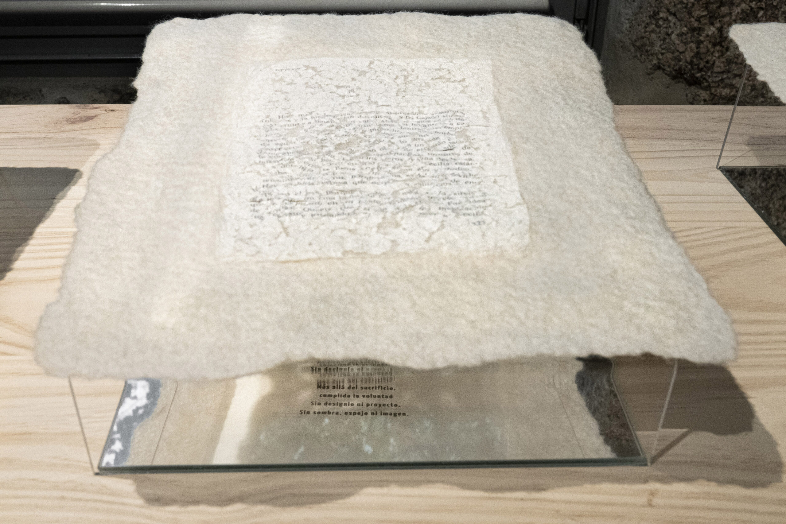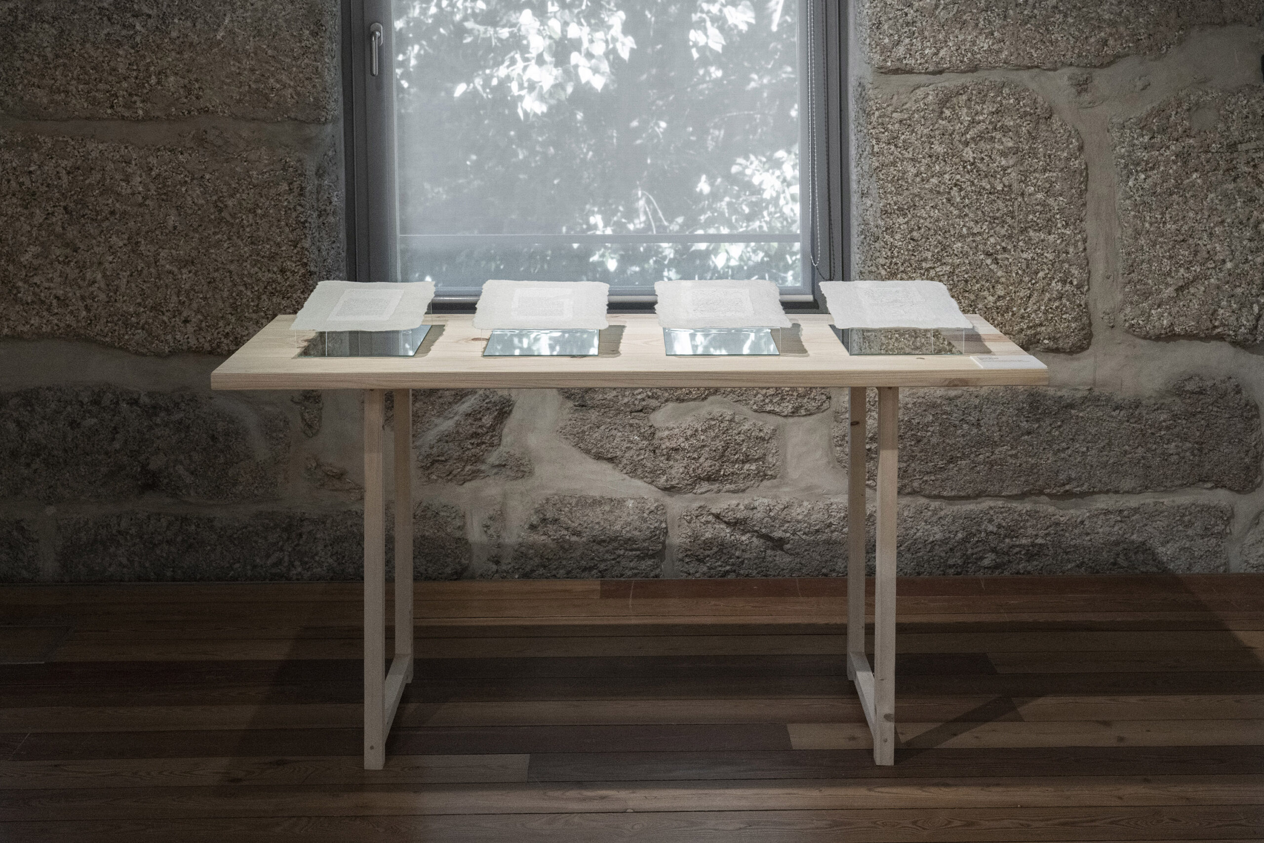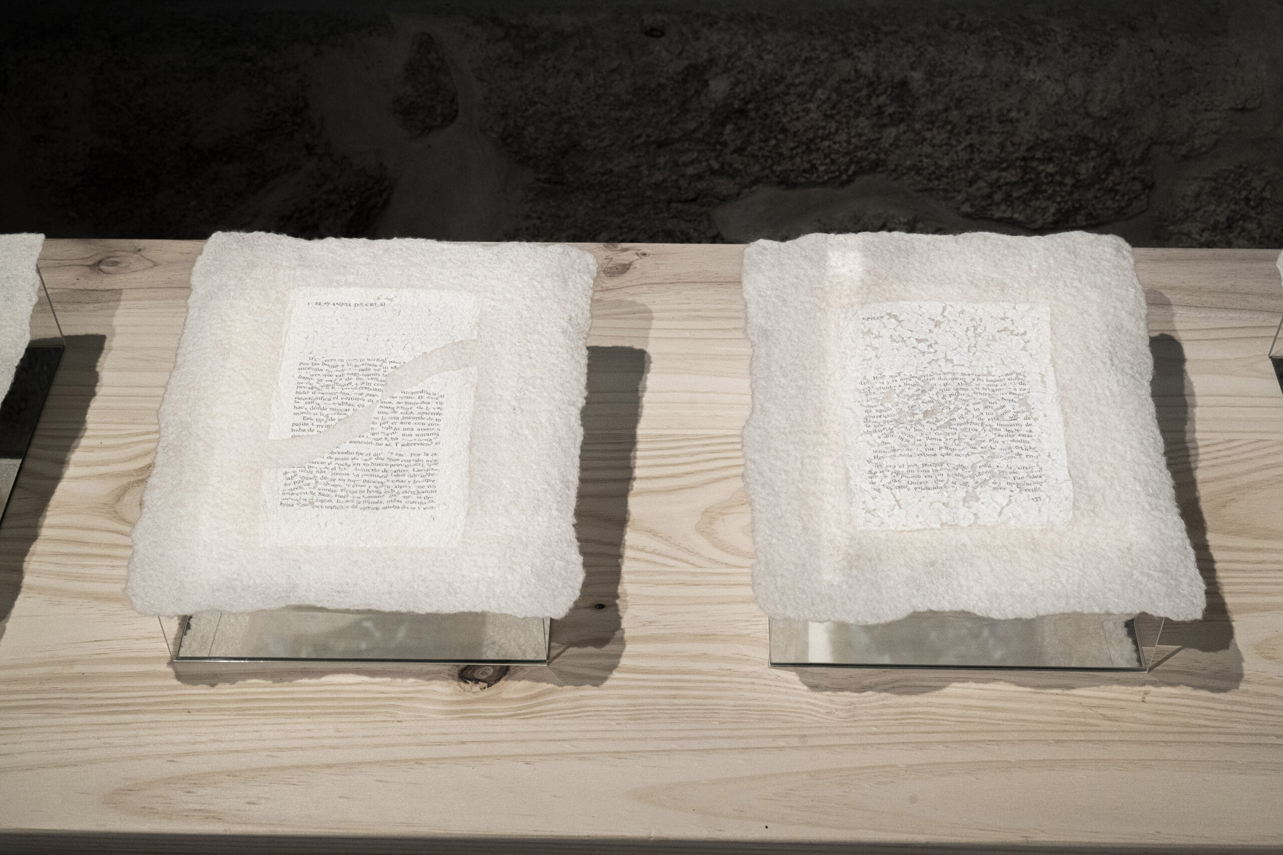 El poder contar con ellos fue un verdadero regalo. Cuando participo en una exposición colectiva muchas veces tengo la sensación de que los comisarios o montadores de la exposición no llegan a entender cómo se debe montar alguna de mis obras. El espacio de exposición fue una antigua fábrica de teñido de lana, maravilloso, pero con una presencia arquitectónica muy fuerte. Cuando llegamos a la sala donde se expondrían mis piezas empezamos a ver juntos el espacio, cómo colocarlas de nuevo para que se relacionaran con las otras obras, a mover focos para conseguir la mejor iluminación, a tapar marcas de la pared etc. Paulo e Ignacio hicieron suyas mis obras y construimos juntos el proyecto expositivo; tuve la sensación de que mis obras crecían.